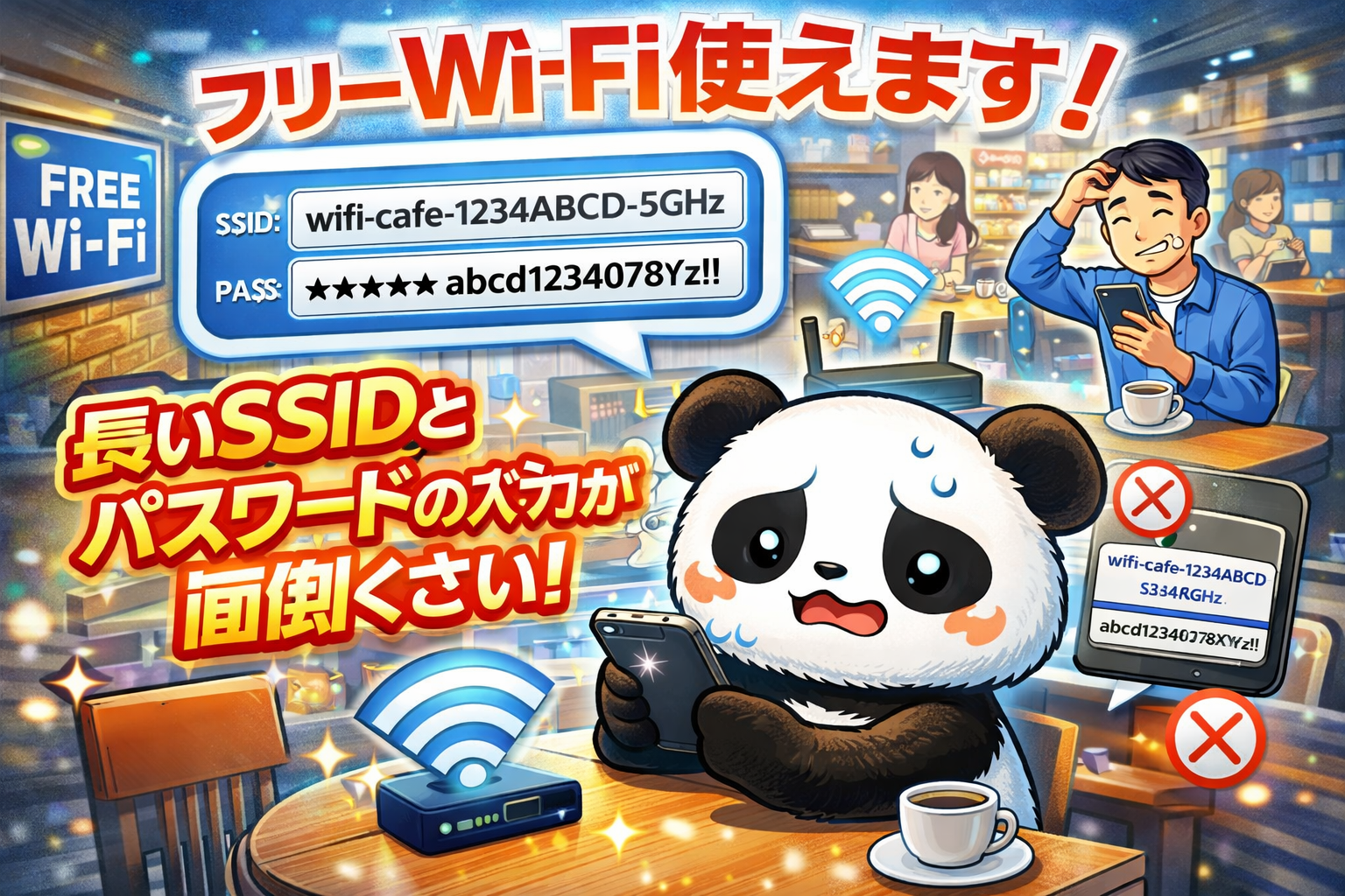 いろいろな飲食店で「フリーWi-Fi使えます」という案内をみるケースがございます。しかしながら、そこに貼られた長いSSIDやパスワードなどを設定するのが非常に面倒だと思うケースが多々あります。せっかくお客様に使っていただきたいためにフリーWi-Fiを導入したのものの、使われなければ全く意味がありません。