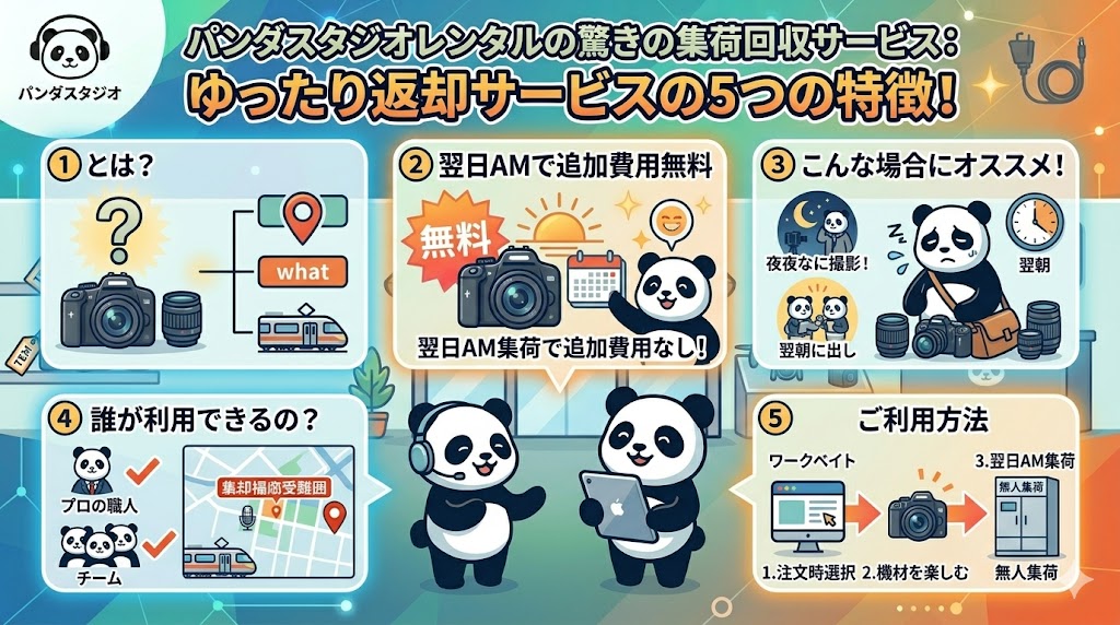 パンダスタジオレンタルはお客様の利便性を更に向上させるため、レンタル最終日の翌日午前中に集荷の「ゆったり返却サービス」を開始いたします。皆様のご利用をお待ちしております。