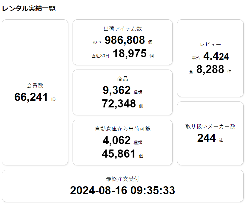 - 会員数57,000以上、8,000種類、65,000点の豊富な自社在庫。のべ85万点以上のレンタル貸出実績。(最新の数値はこちらで公開しています。)