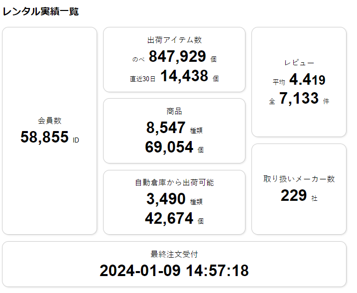 - 会員数57,000以上、8,000種類、65,000点の豊富な自社在庫。のべ85万点以上のレンタル貸出実績。(最新の数値はこちらで公開しています。)