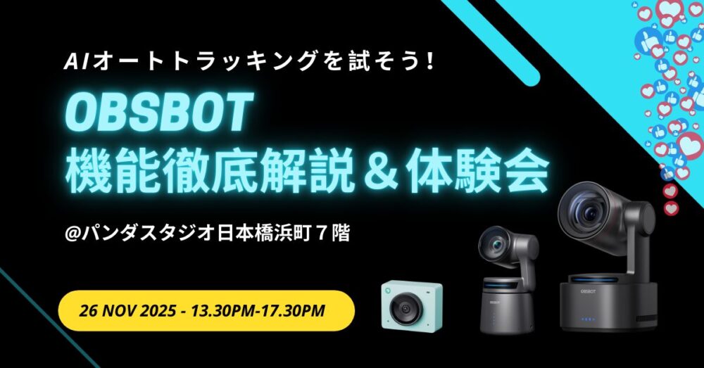 2025 年 11 月 26 日 (水) パンダスタジオ浜町 7F にて、After InterBEE Week 3 日目は AI カメラメーカー OBSBOT の最新製品を体験できる配信・撮影セミナーを開催いたしました!