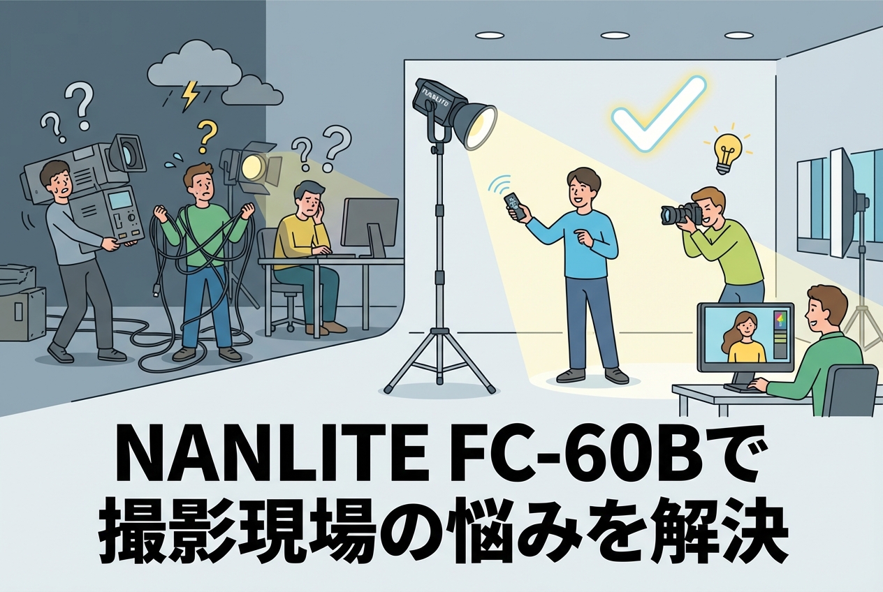 NANLITE FC-60Bは、プロフェッショナルな撮影現場で求められる高い性能と汎用性を兼ね備えた撮影用ライトです。78W出力、2700-6500Kの幅広い色温度調整、CRI96の優れた色再現性を備えており、スタジオ撮影からロケーション撮影、ビデオ制作まで幅広い用途に対応できます。本記事では、NANLITE FC-60Bの特徴と実践的な活用方法について詳しく解説します。