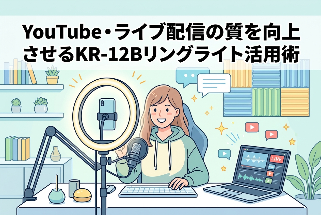 YouTube動画、特に人物がメインとなるコンテンツにおいて、ライティングは視聴者に与える印象を大きく左右します。KR-12Bのようなリングライトを正面から当てることで、顔全体を均一に明るく照らし、鼻の下や顎の下にできやすい不自然な影を効果的に消すことができます。影のないクリアなライティングは、表情を明るく見せ、清潔感や信頼感を演出します。これにより、視聴者はコンテンツの内容に集中しやすくなり、発信者への好感度も高まります。レビュー動画や解説動画、Vlogなど、カメラに向かって話すスタイルの撮影では、この「影を消す」効果がプロフェッショナルな映像品質を生み出すための基本となります。KR-12Bを使えば、誰でも簡単にスタジオで撮影したかのような、クリーンで美しい映像を手に入れることが可能です。
