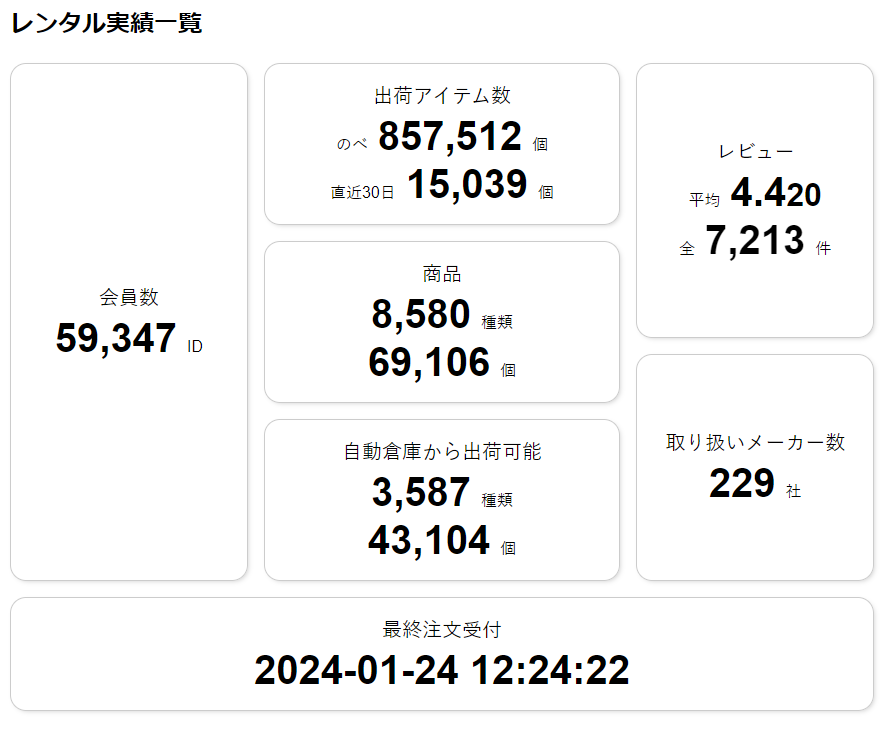 - 会員数57,000以上、8,000種類、65,000点の豊富な自社在庫。のべ85万点以上のレンタル貸出実績。(最新の数値はこちらで公開しています。)