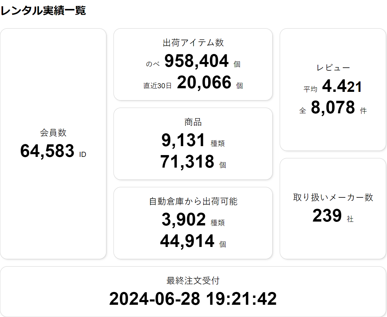 - 会員数57,000以上、8,000種類、65,000点の豊富な自社在庫。のべ85万点以上のレンタル貸出実績。(最新の数値はこちらで公開しています。)