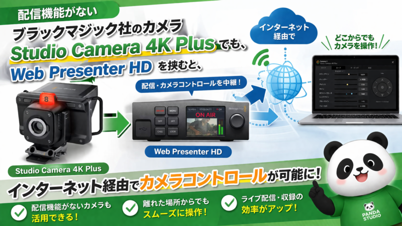 ライブ配信 配信機能がないブラックマジック社のカメラ「Studio Camera 4K Plus」でも、Web Presenter HD を挟むと、インタネット経由でカメラコントロールできるお話 2023.08.222026.04.08
