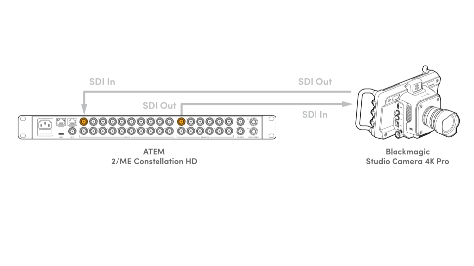 ATEM SDI スイッチャーは Blackmagic の Studio Camera シリーズ向けにカメラ制御機能(黒レベル、ゲイン、カラー等)をリモートで可能にし、すべてSDI ケーブル一本で操作が完結します。