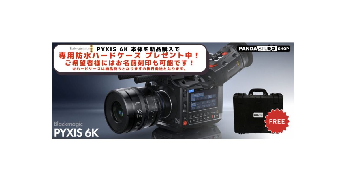 『Blackmagic PYXIS 6K』にパンダスタジオの購入限定特典として、で専用防水ハードケースをプレゼント致します!専用ケース本体の価格は通常55,000円相当のものですので非常にお得なキャンペーンとなっております。また、ハードケースにはレーザー刻印機でお名前や社名を刻印する事も可能となります!