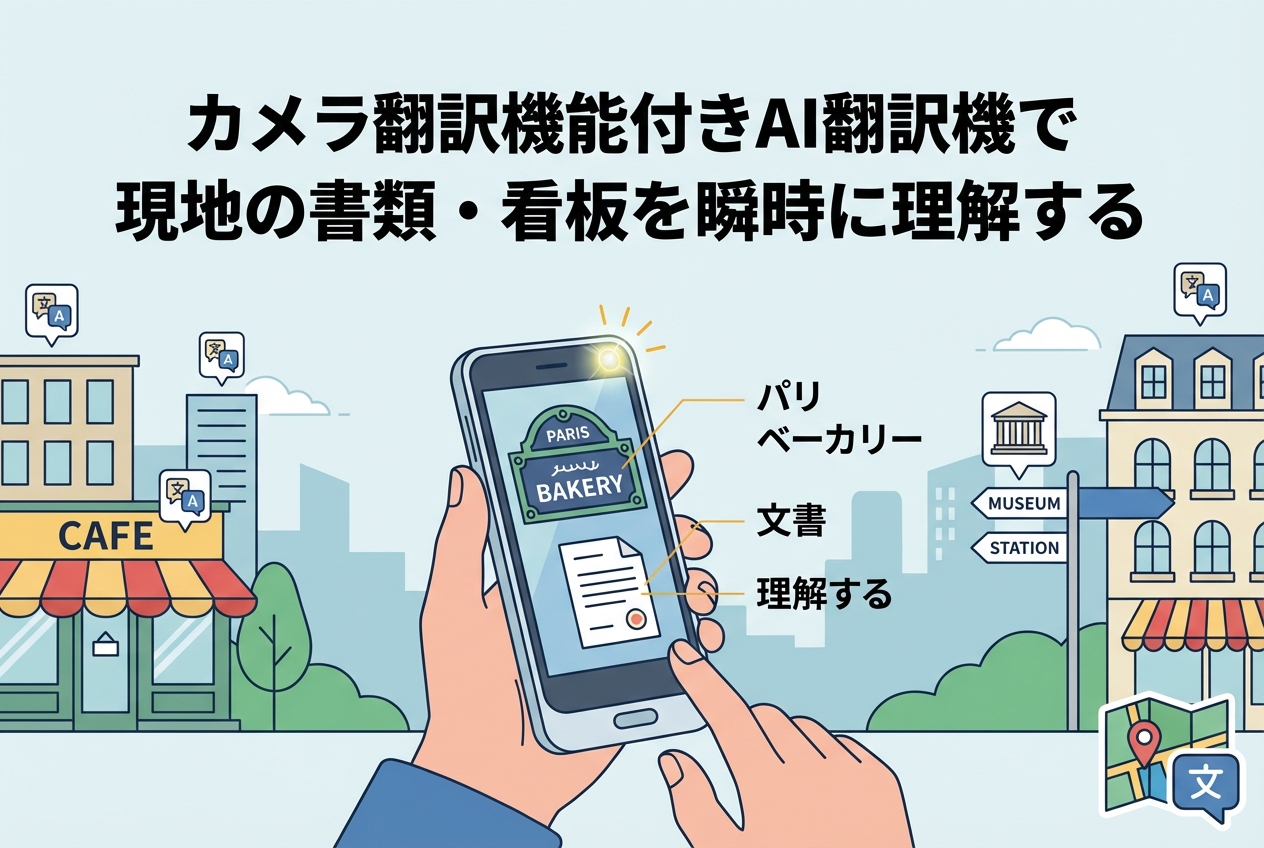 海外出張や旅行において、現地の書類・看板・メニューを素早く理解できるかどうかは、ビジネスの成否を左右する重要な要素です。近年、AI翻訳機に搭載されたカメラ翻訳機能は飛躍的な進化を遂げ、137言語対応・283ヵ国対応の高精度翻訳が手のひらサイズのデバイスで実現できるようになりました。本記事では、カメラ翻訳の仕組みから実践的な活用法、ChatGPT搭載による精度向上の理由まで、ビジネスパーソンが知るべき情報を網羅的に解説します。