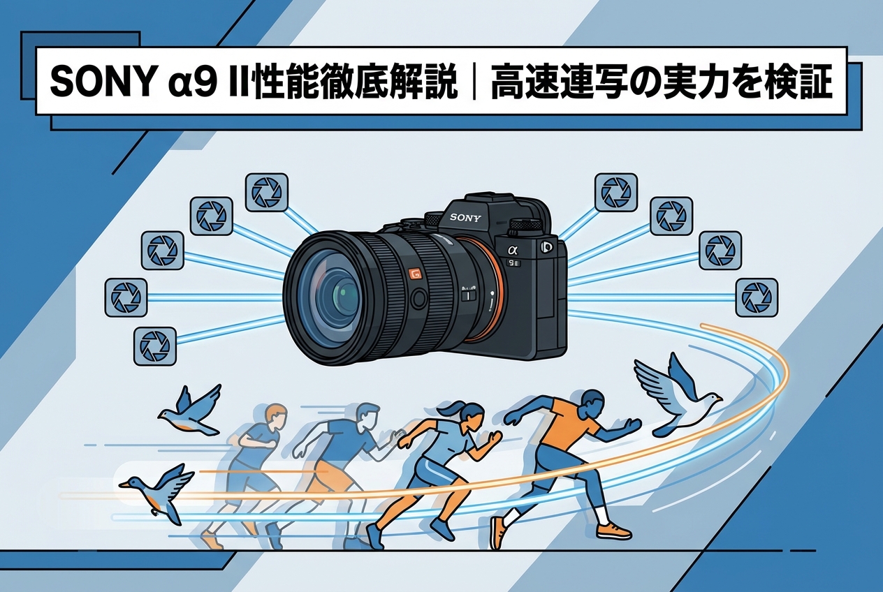 SONY α9 II ILCE-9M2(ボディーのみ) SONY(ソニー)は、プロフェッショナルフォトグラファーの要求に応えるために開発されたフルサイズミラーレスカメラのフラッグシップモデルです。最高約20コマ/秒のブラックアウトフリー連続撮影、リアルタイムトラッキングAF、有線LAN対応など、スポーツや報道の最前線で求められる性能を凝縮した一台として高い評価を受けています。本記事では、SONY α9 IIの基本スペックから高速連写性能、AF性能、通信機能、動画性能に至るまで、あらゆる角度から徹底的に解説します。購入を検討されている方はもちろん、既にお持ちの方にも新たな発見があるよう、実践的な情報をお届けいたします。