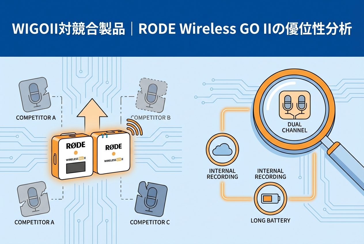 ワイヤレスマイクシステムの導入を検討する際、製品選定は業務効率と成果物の品質に直結する重要な意思決定です。RODE Wireless GO II ワイヤレスマイクシステム WIGOIIは、コンパクトなボディに高度な機能を凝縮し、ビジネスシーンから映像制作まで幅広い用途で支持を集めています。しかし、DJI Mic 2やHollyland Lark M1、Saramonic Blink500 Pro B2など、競合製品も急速に進化を遂げており、最適な選択肢を見極めるには客観的な比較分析が不可欠です。本記事では、RODE Wireless GO II(WIGOII)の技術的優位性を競合製品との比較を通じて多角的に分析し、ビジネス活用における実践的なメリットと導入時の選定ポイントを詳しく解説いたします。