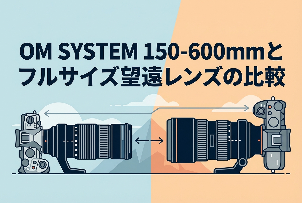 超望遠撮影システムの導入コストは、レンズ単体だけでなくボディやアクセサリーを含めたトータルで評価する必要があります。OM SYSTEM OM-1 Mark IIのボディ価格は約28万円であり、150-600mmレンズとの組み合わせで約61万円のシステムが構築できます。このシステムで35mm換算1200mm相当の超望遠撮影が手持ちで実現できます。フルサイズシステムで同等の望遠到達力を確保する場合、例えばSony α1(約80万円)とFE 200-600mm(約26万円)に2倍テレコンバーター(約7万円)を加えると約113万円となり、それでも画質面での妥協が伴います。さらに、フルサイズ超望遠システムでは大型三脚(約5-15万円)や専用バッグの追加投資も必要となるケースが多く、トータルコストの差はさらに拡大します。限られた予算の中で最大限の望遠性能を得たい場合、マイクロフォーサーズシステムのコストパフォーマンスは極めて優れていると評価できます。